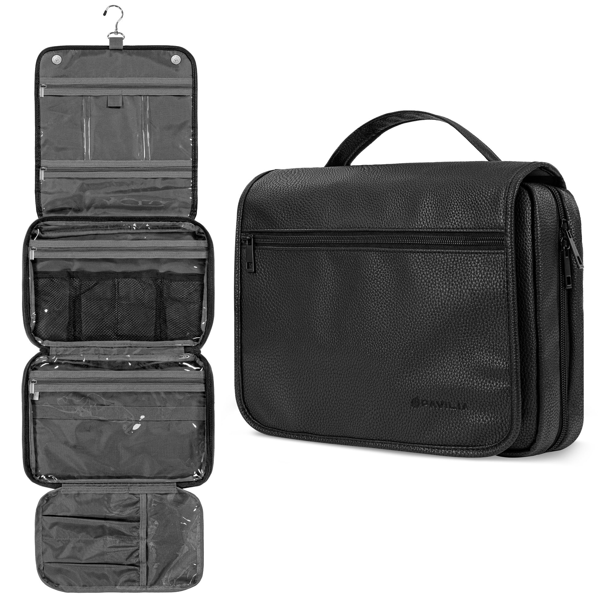 PAVILIA large travel bag toiletry organizer case has a large central compartment and two side pockets to fit all your travel toiletries containers, makeup, and cosmetic bottles. Main compartment has 6 mesh pockets to fit skincare bottles, shampoo while side smaller pockets are designed to hold make up brush, toothbrush. This is a travel must have for vacation, flying, gym, cruise, and home.