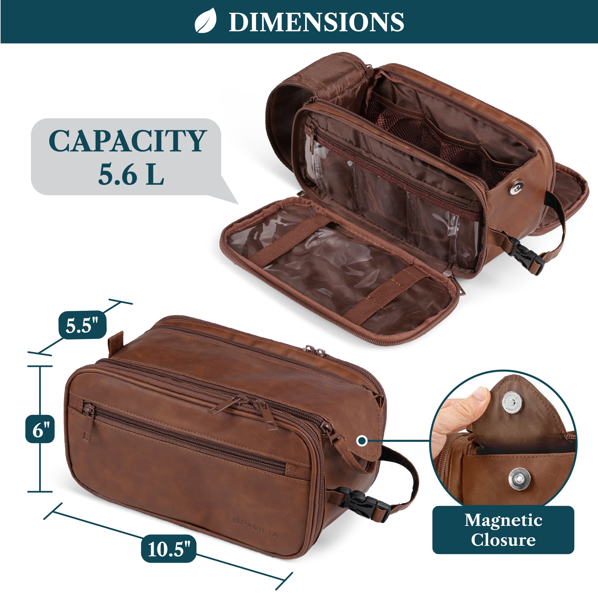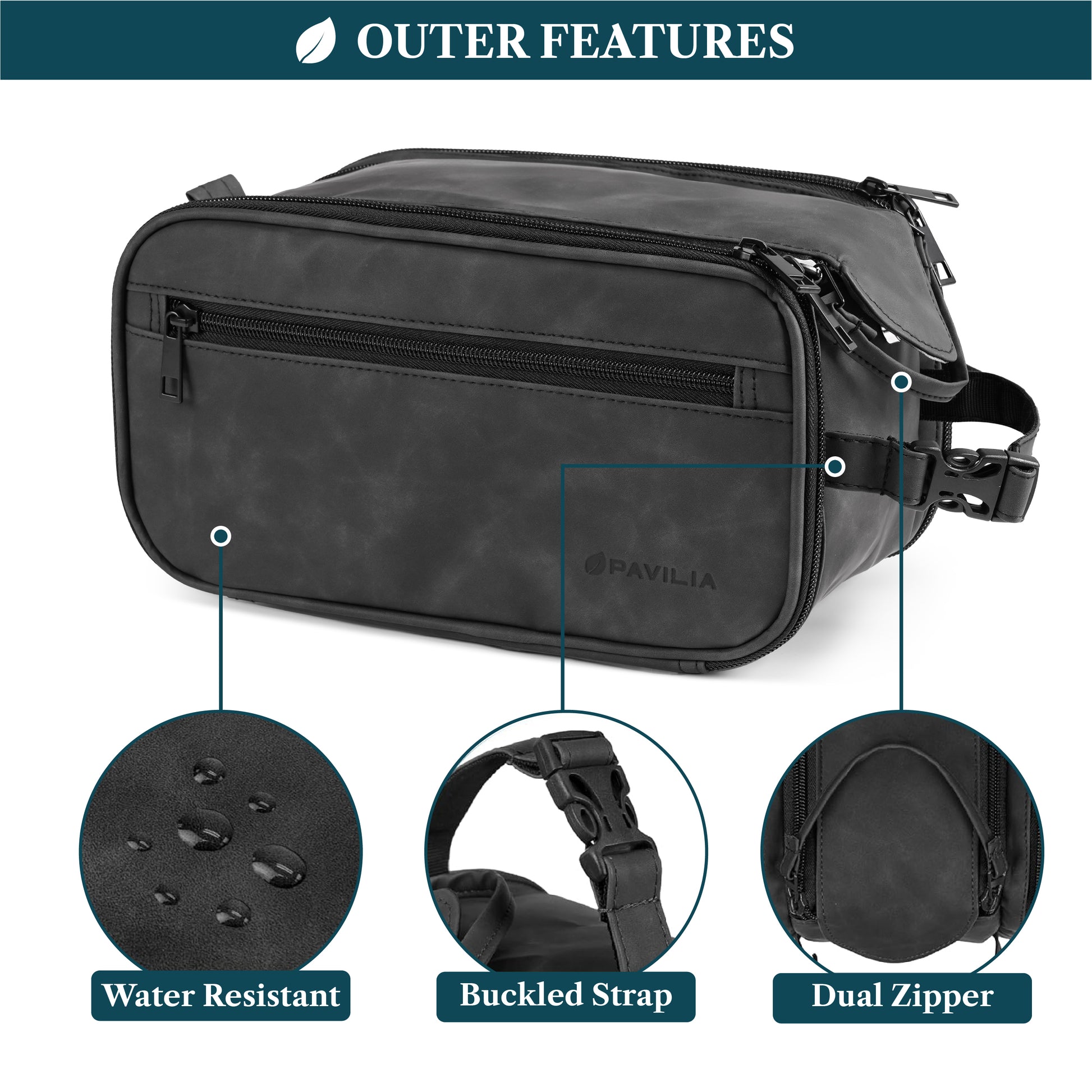 - WATER RESISTANT TOILETRY BAG DOPP KIT: This toiletry case kit is made from high density PU leather with added side padding for durability and extra protection to keep your toiletries safe and protected during travel. The lining is water-resistant to prevent liquid splashes from entering the bag or luggage. The toiletry bag also offers excellent wet/dry separation so you can keep wet accessories in a separate compartment from dry toiletries during camping, road trips, weekenders.