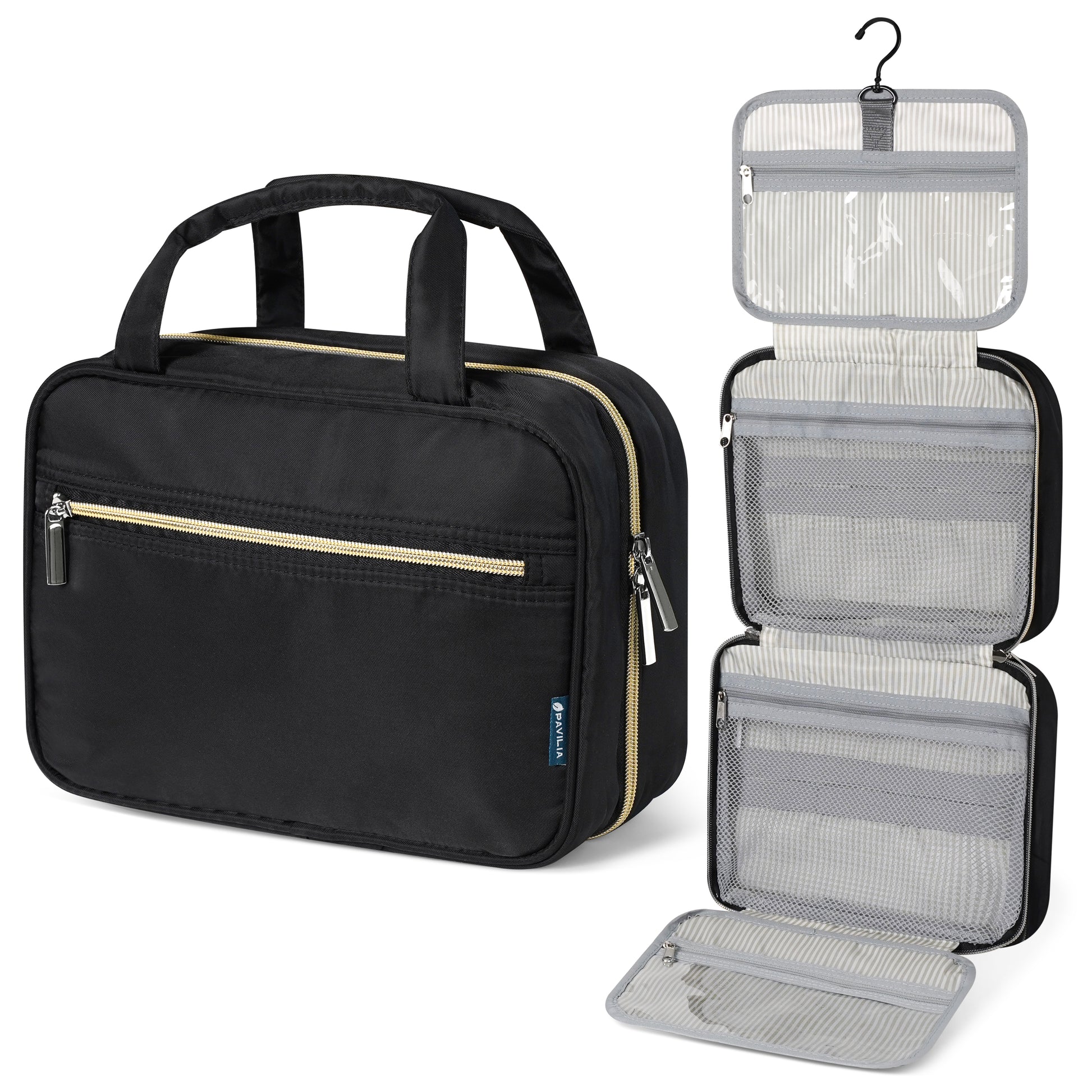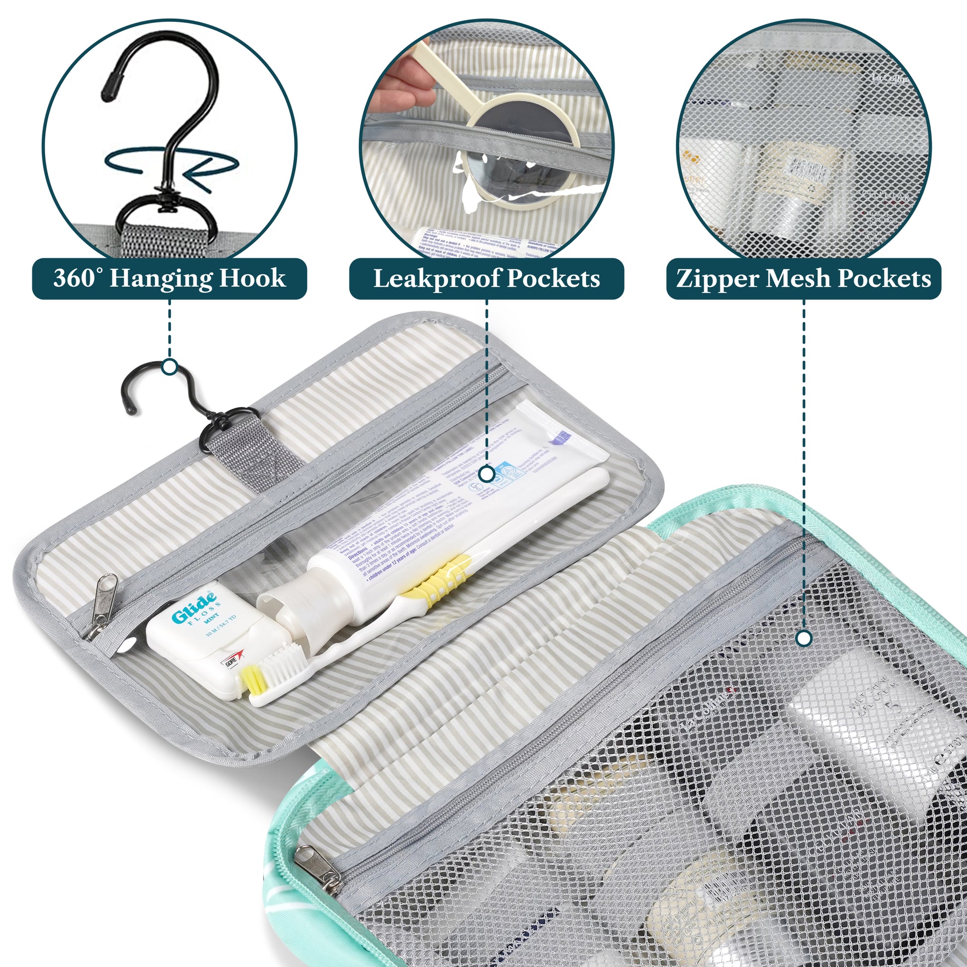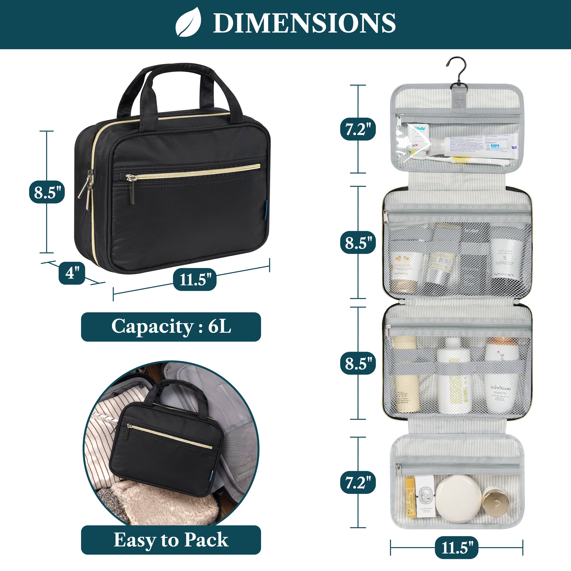 - FOR THE SMART TRAVELER This hanging toiletry bag is extremely functional; Equipped with a large central compartment and two side pockets, this bag has over 12 smaller pockets that let you organize all your toiletry from toothbrush, makeup brush, and other cosmetics/hygiene needs.