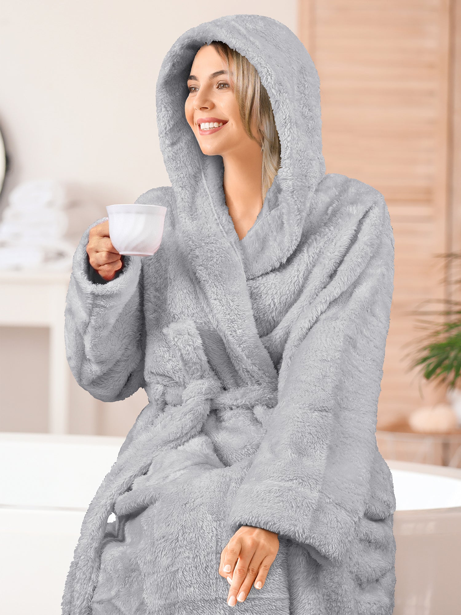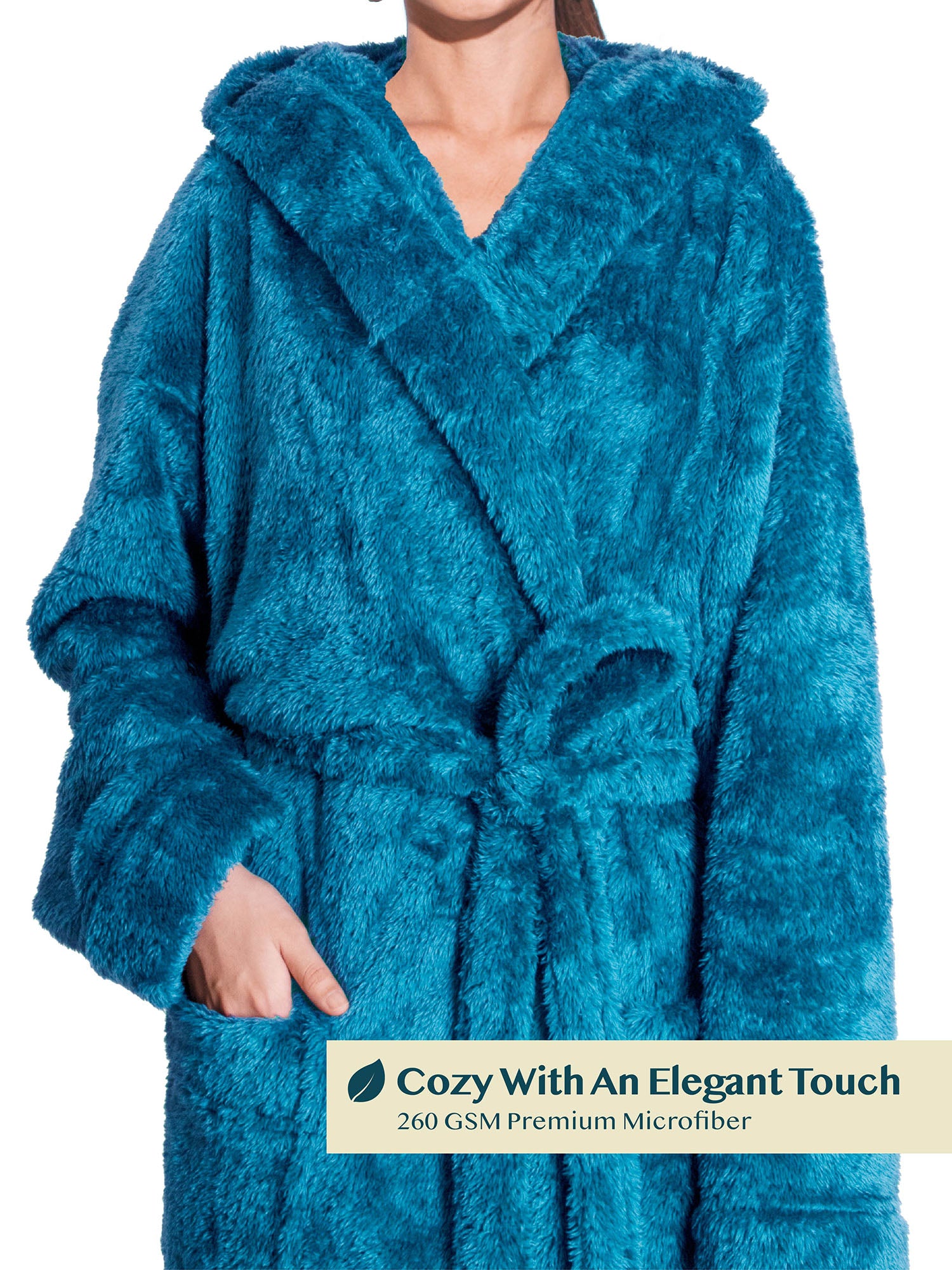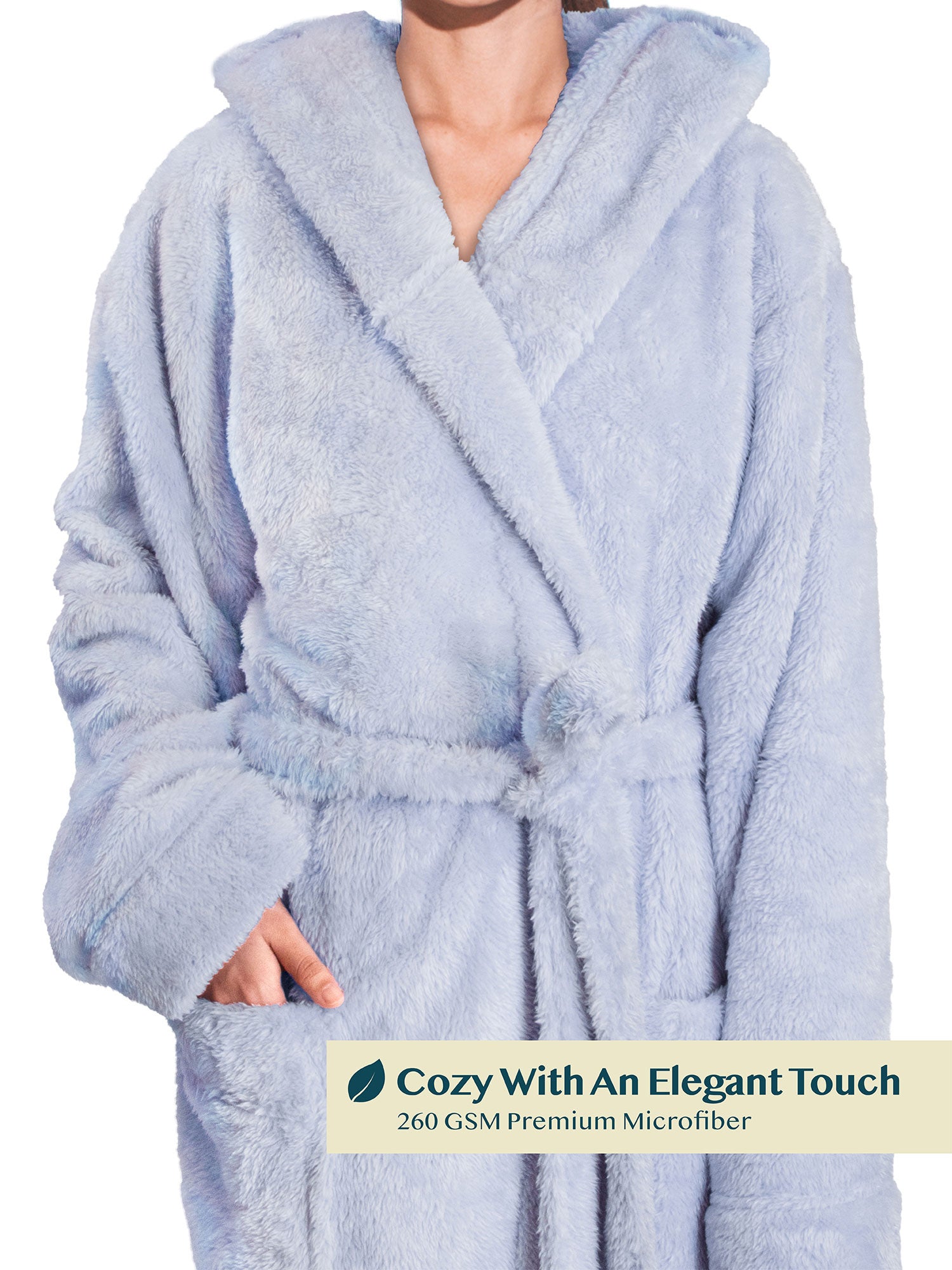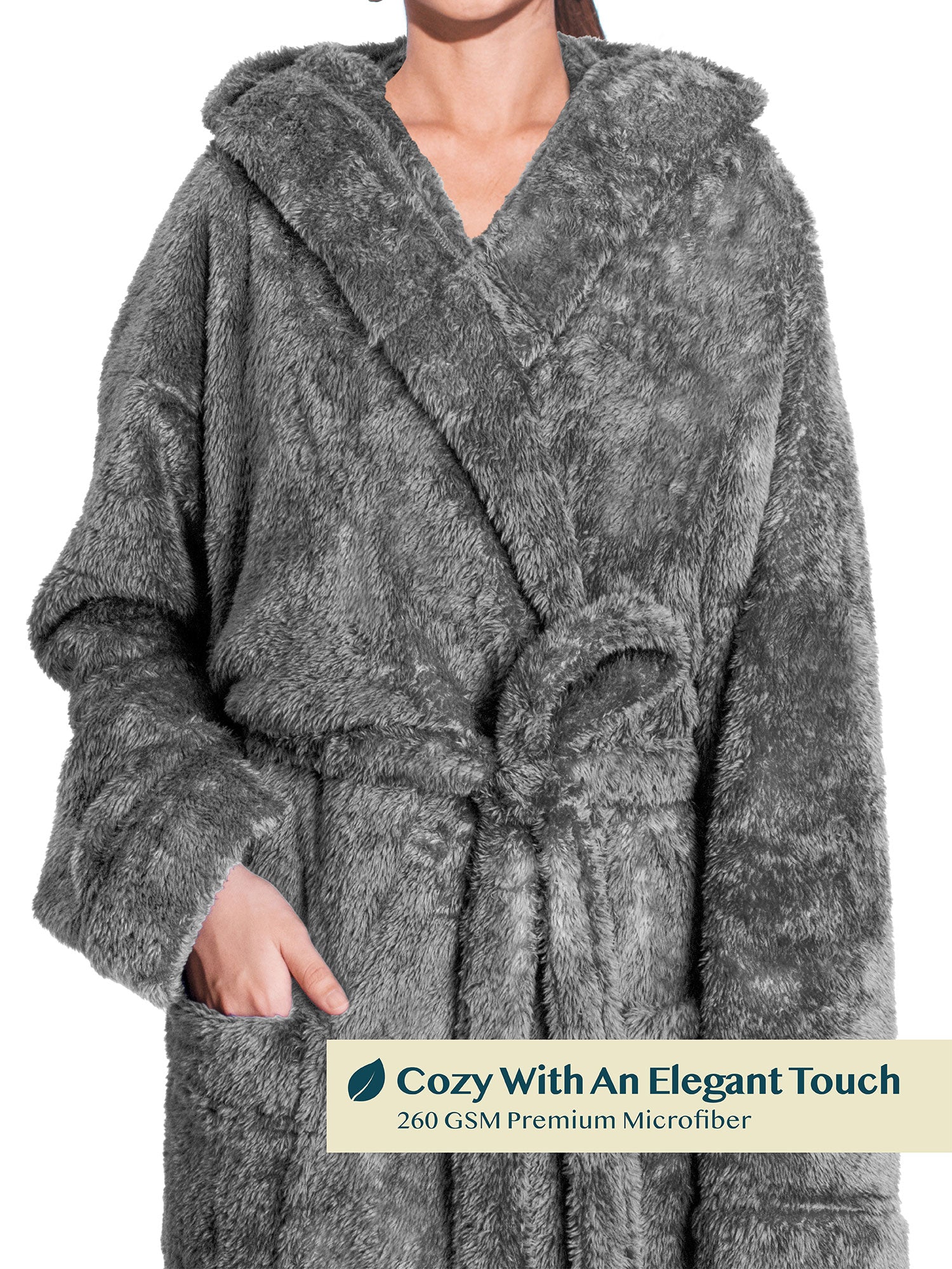 - FLUFFY TEDDY SHERPA FLEECE ROBE Our Premium Women Fleece Long Hooded Robe is soft on your skin, lightweight, and keeps you warm. We made the robe of fluffy teddy sherpa fabric to make it cozy with an elegant touch!