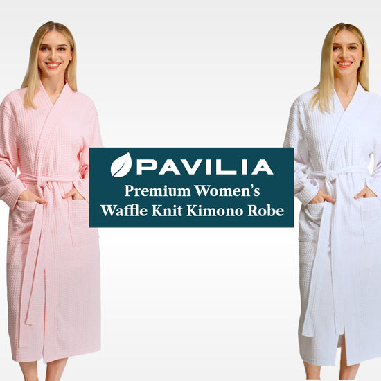 WOMENS WAFFLE KIMONO ROBES: PAVILIA luxurious waffle robe for women is super soft, cozy, anti-pill, breathable and lightweight and you will never want to take it off. Its delicate microfiber polyester construction ensures a soft touch that will caress your skin with every wear. Features 2 large side pockets for keeping hands warm and storing remotes, glasses, keys, the long robe boasts the perfect fit and comes with a waist strap for easily adjusting to find your ideal comfort level.