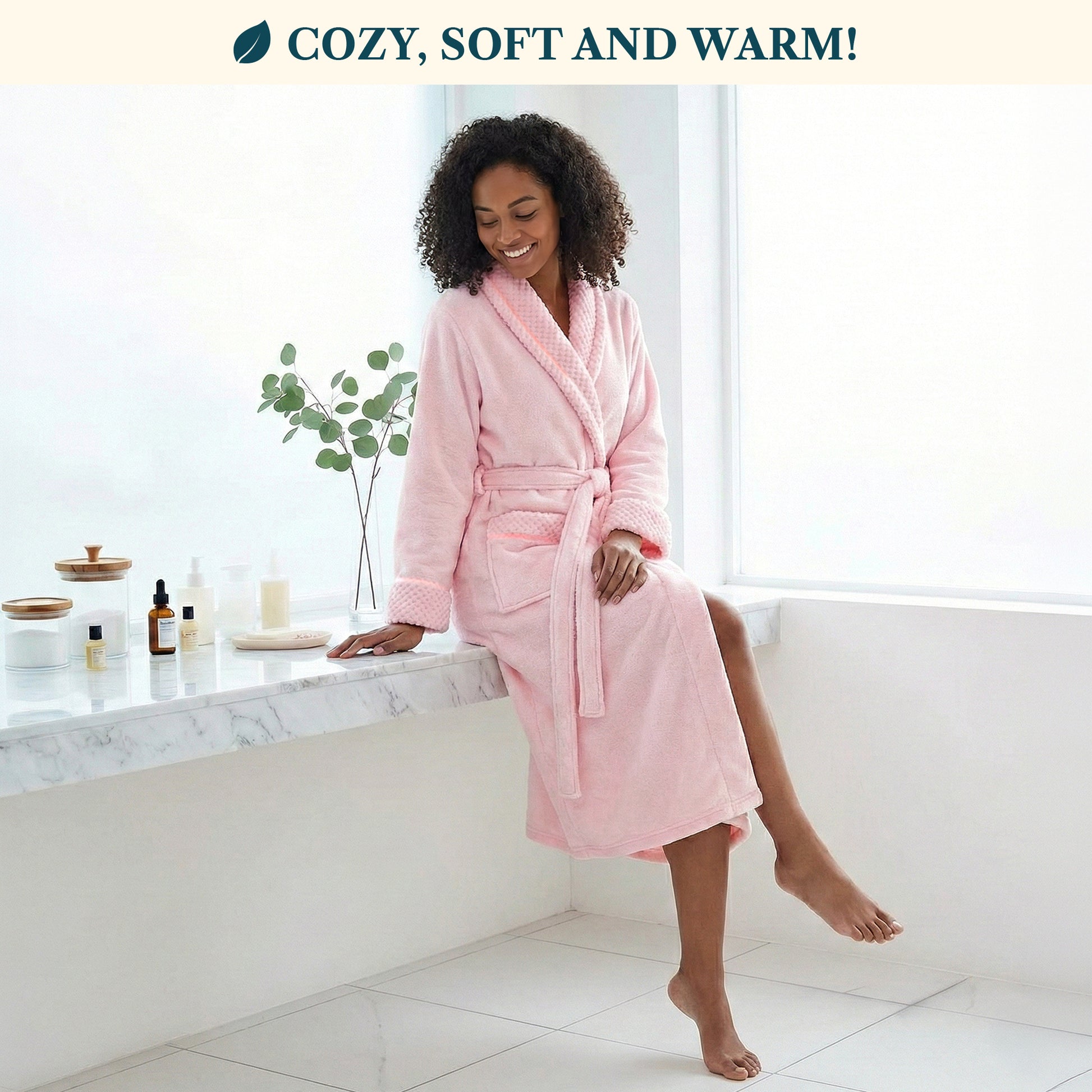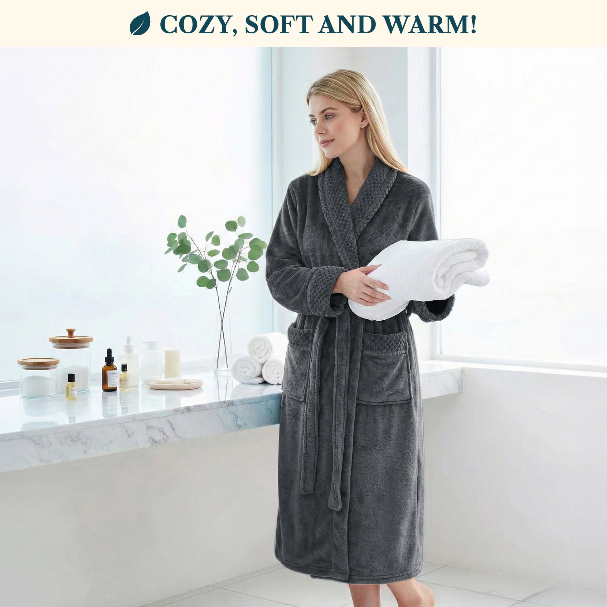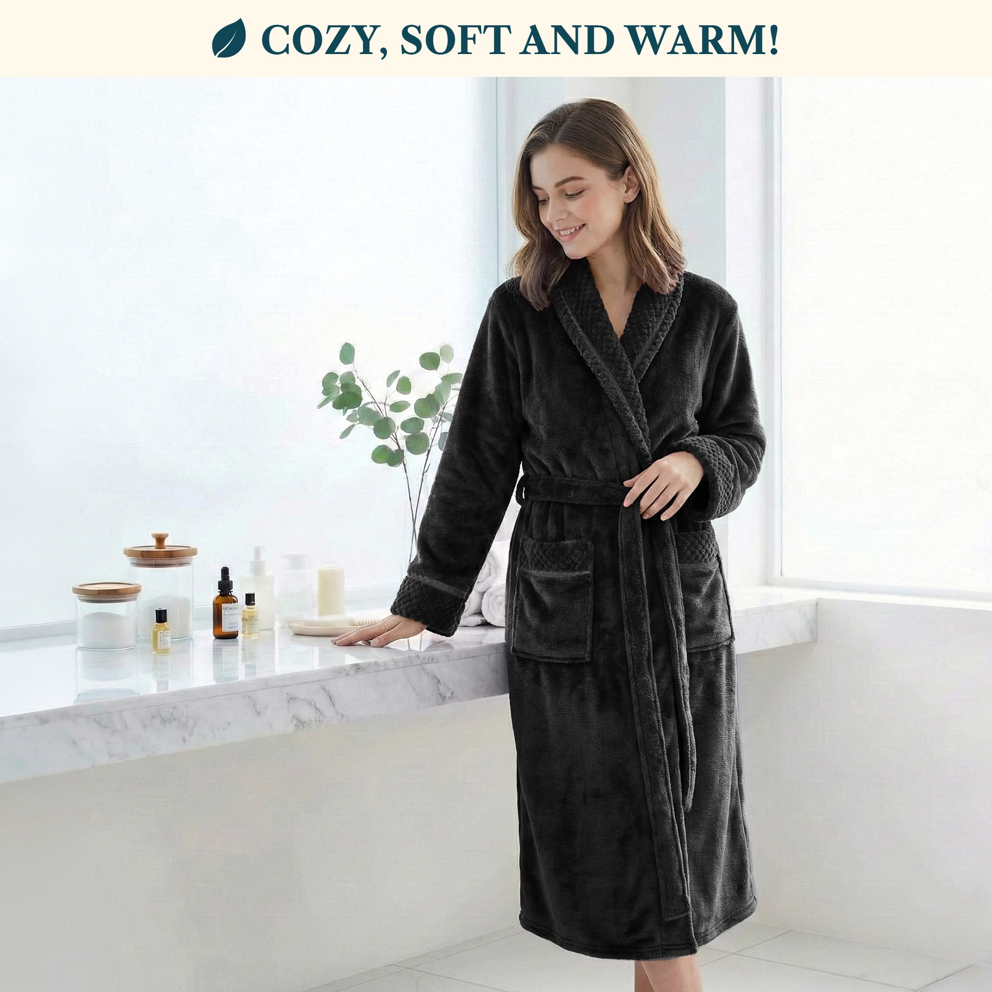 - PERFECT FIT AND FUNCTIONAL Comes with a waist strap so you can adjust for perfect fit and 2 side pockets to keep all your essentials! The shawl collar neck is a classic and keeps your neck comfortable and warm. Long length robe with long sleeves for soft and snuggly warmth after spa, bath, or shower.