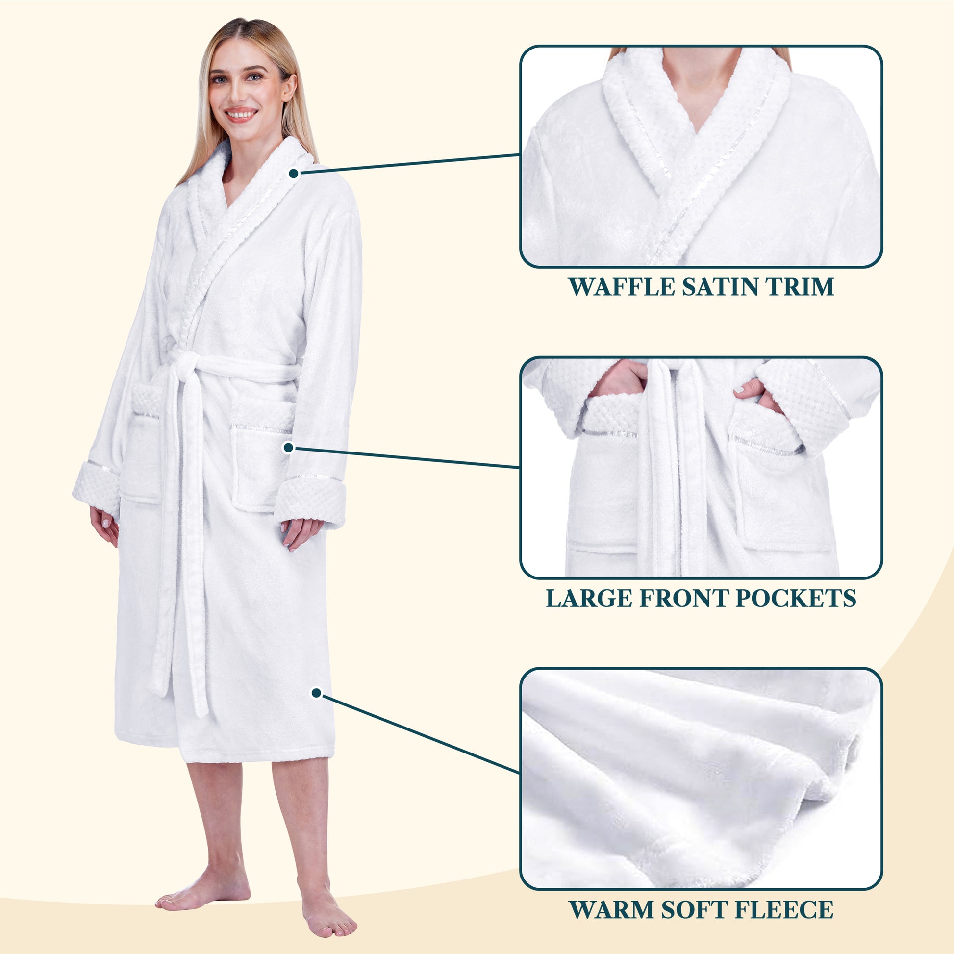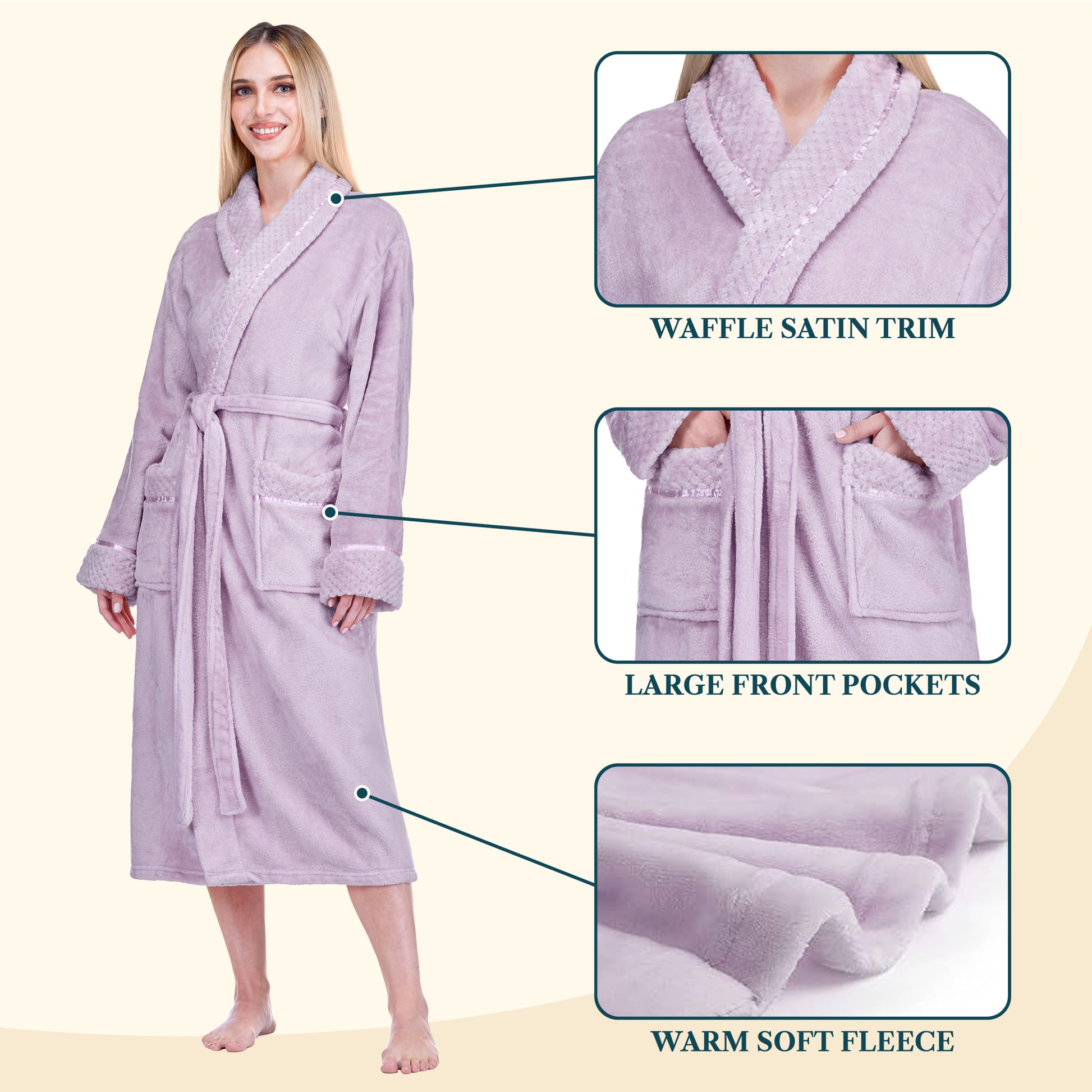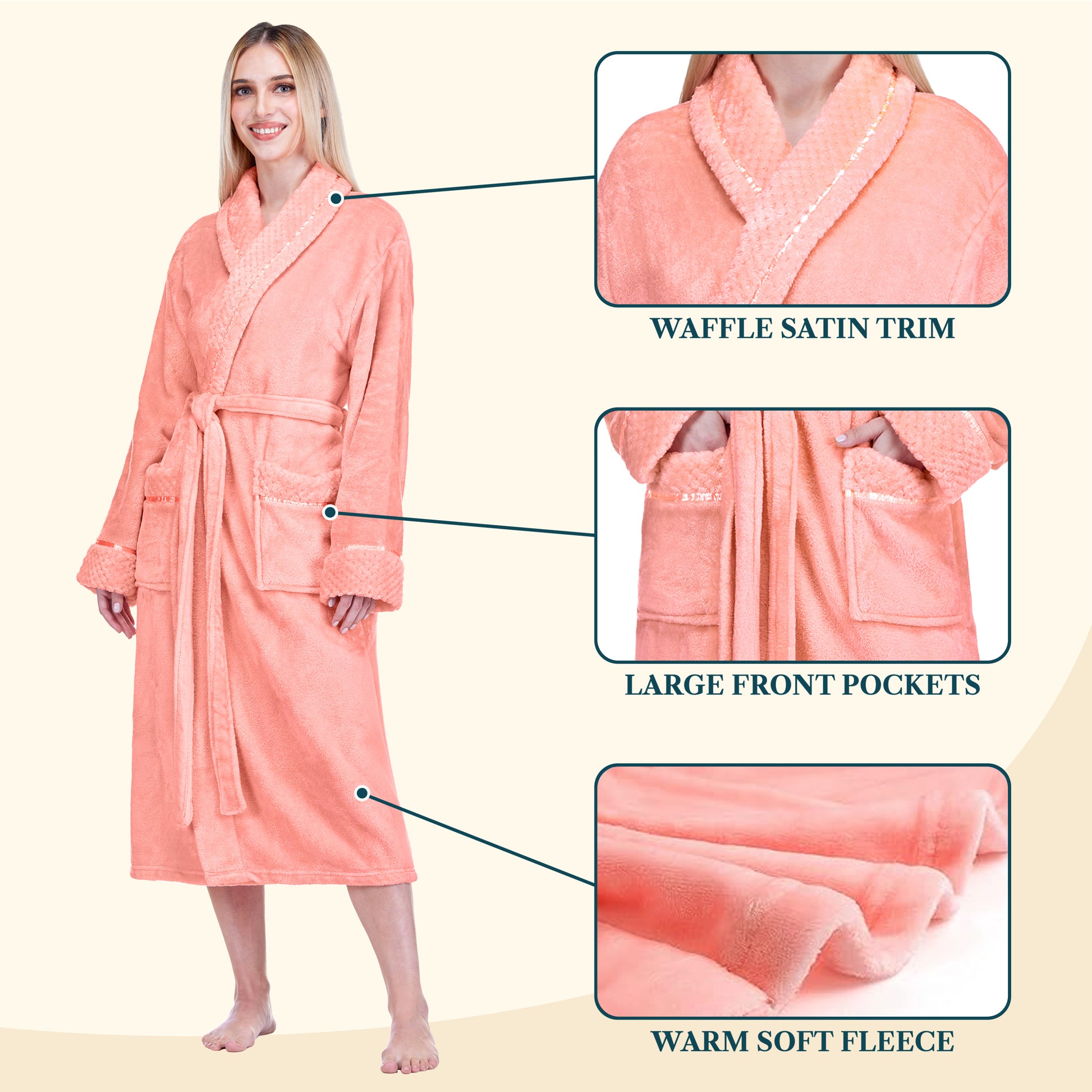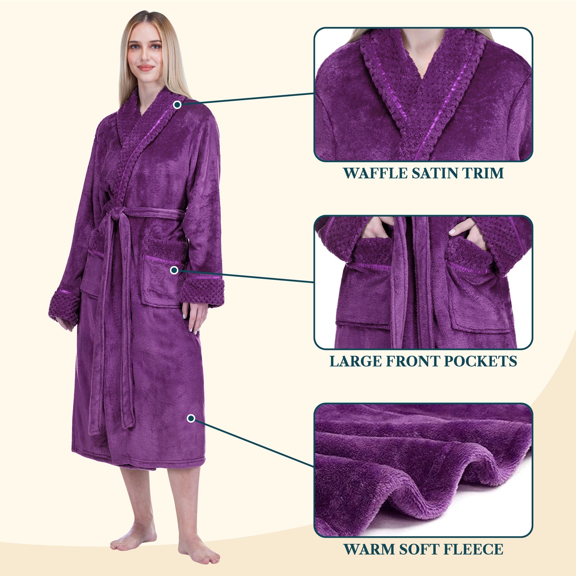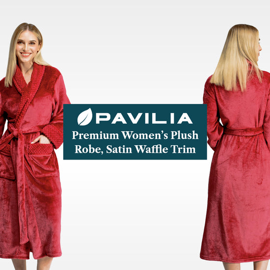 Our Premium Women Fleece Robe is soft on your skin, lightweight, cozy, and keeps you warm. We accented the robe with satin trim to give it an extra luxurious feel and added the waffle texture cuff, neck, and pockets to take this style to a new level!